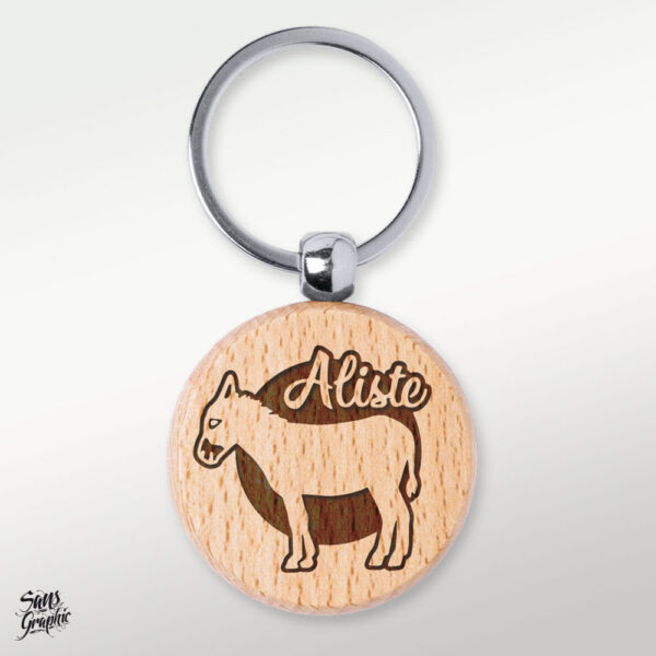 Llavero de madera grabado a láser con un burro alistano junto a la inscripción Aliste.
