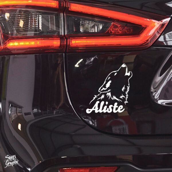 Pegatina adhesiva realizada en vinilo con forma recortada de 10x15cm con diseño de lobo ibérico y el nombre de Aliste. Si la quieres con algún otro nombre, o sin ninguno, háznoslo saber en comentarios.