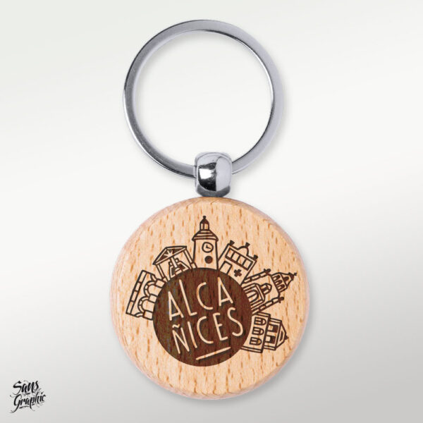 Llavero de madera grabado a láser con ilustraciones de algunos de los edificios más emblemáticos De la Villa de Alcañices, como los puentones, el cañico de abajo, la torre del reloj, la farmacia, el convento de San Francisco y las antiguas escuelas.