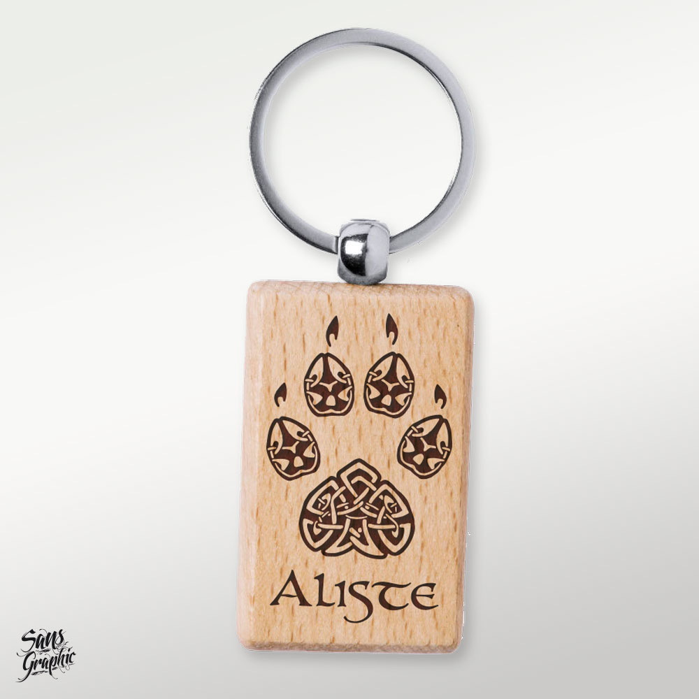 Llavero de madera grabado a láser con ilustración huella de lobo ibérico con estilo celta junto a la inscripción Aliste.