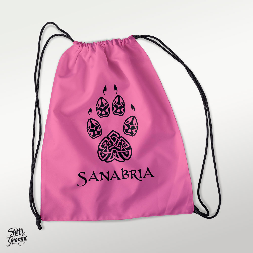 Mochila de cuerdas estampada con ilustración de una huella de lobo ibérico de estilo celta junto a la inscripción Sanabria. Si la deseas con otro texto, o sin ninguno, háznoslo saber en comentarios.