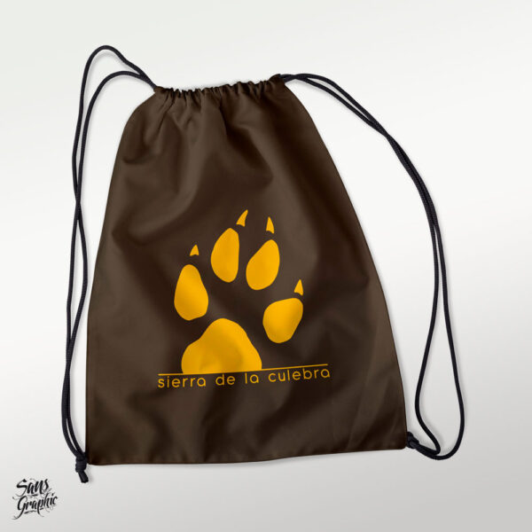 Mochila de cuerdas estampada con ilustraciones de una huella de lobo ibérico con la inscripción Sierra de la Culebra.