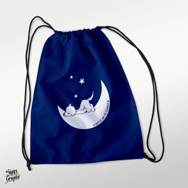 Mochila de cuerdas estampada con ilustración de un lobezno sobre la luna con la inscripción Sierra de la Culebra.