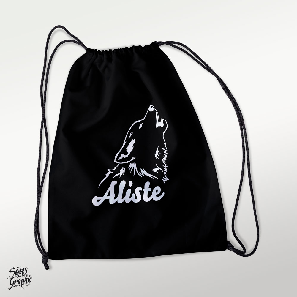 Mochila de cuerdas estampada con ilustración de la cabeza de un lobo ibérico junto a la inscripción Aliste.