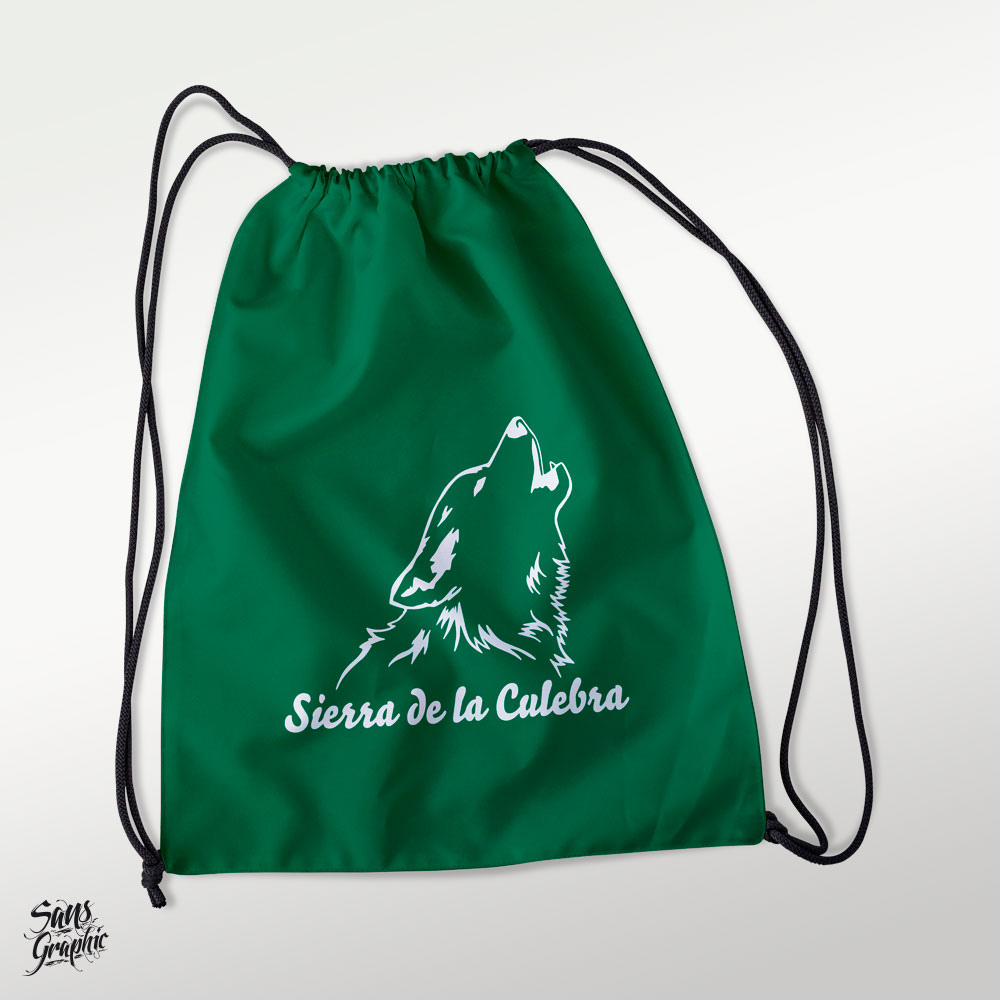 Mochila de cuerdas estampada con ilustración de la cabeza de un lobo ibérico junto a la inscripción Sierra de la Culebra.