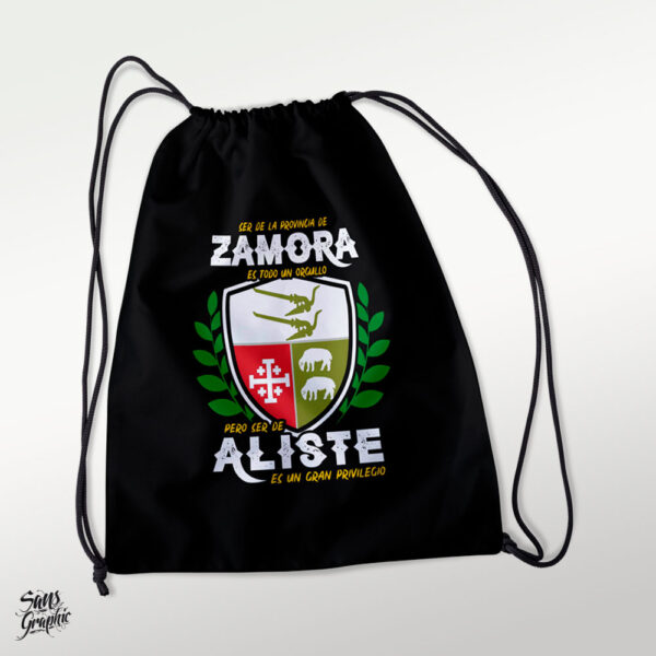 Mochila de cuerdas estampada con el escudo de la Comarca de Aliste junto a la frase «Ser de la provincia de Zamora es todo un orgullo, pero ser de Aliste es un gran privilegio».  Si la quieres con otro texto/escudo, háznoslo saber en comentarios.