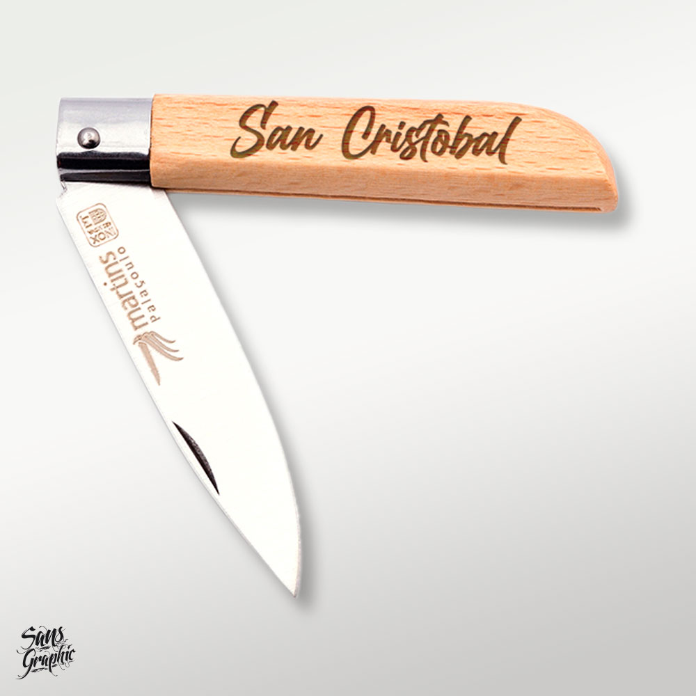 Navaja de madera grabada en láser con el nombre de tu pueblo.