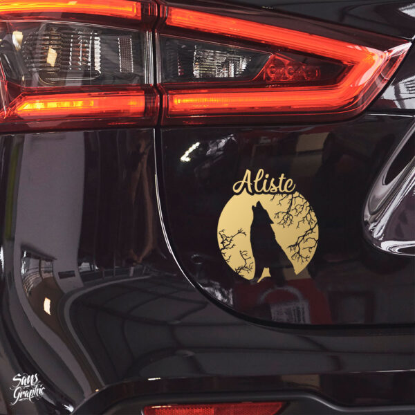 Pegatina adhesiva realizada en vinilo con forma recortada de 15x15cm con diseño de lobo ibérico aullando con la luna de fondo entre ramas y el nombre de Aliste. Si la quieres con algún otro nombre, o sin ninguno, háznoslo saber en comentarios.