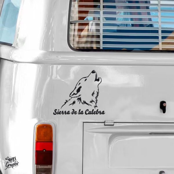 Pegatina adhesiva realizada en vinilo con forma recortada de 10x15cm con diseño de lobo ibérico y el nombre de Sierra de la Culebra. Si la quieres con algún otro nombre, o sin ninguno, háznoslo saber en comentarios.