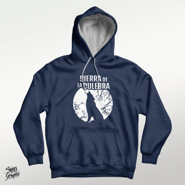 Sudadera capucha unisex con ilustración de lobo ibérico aullando con la luna de fondo entre ramas y la inscripción Sierra de la Culebra.