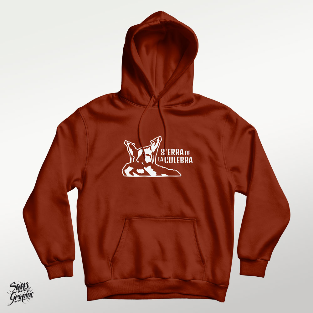 Sudadera capucha unisex con ilustración lobos aullando junto a la inscripción Sierra de la Culebra.