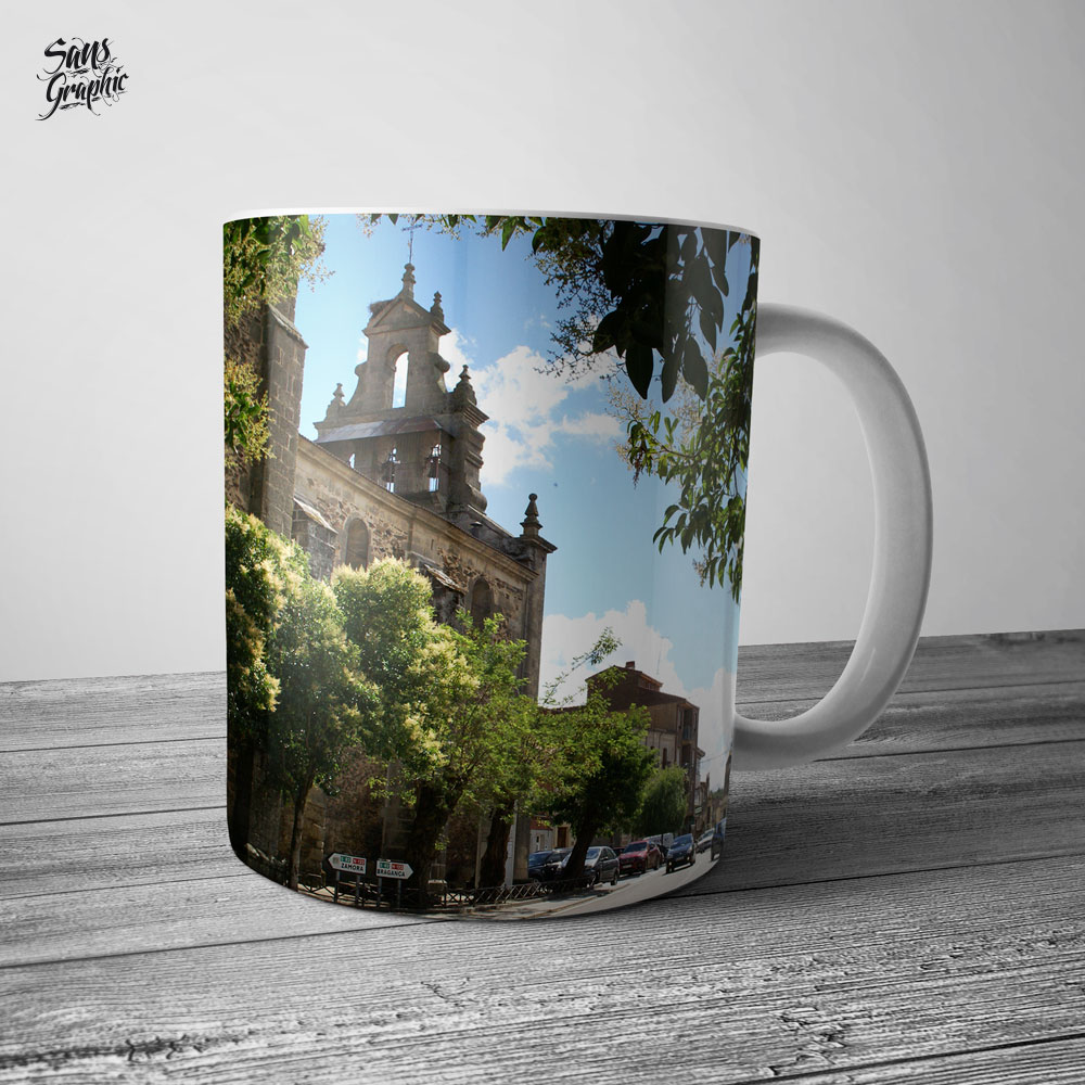 Taza de cerámica de 350ml con fotografía trasera del Convento de San Francisco de Alcañices junto a la Torre del reloj al fondo.